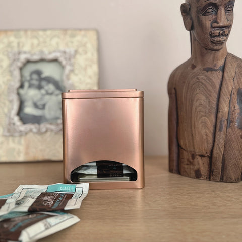 Stylový a praktický dávkovač na čaje navržený speciálně pro kolekce Wrapped Sachets od Harney & Sons. Je vyroben z odolného kovu s metalickým měděným povrchem, který dodá vašemu prostoru luxusní vzhled – ať už v kanceláři, kavárně nebo doma.