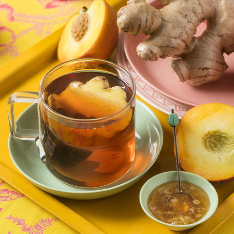 Ingredience: Černý čaj, broskvové a zázvorové aroma, kousky broskví a zázvoru.